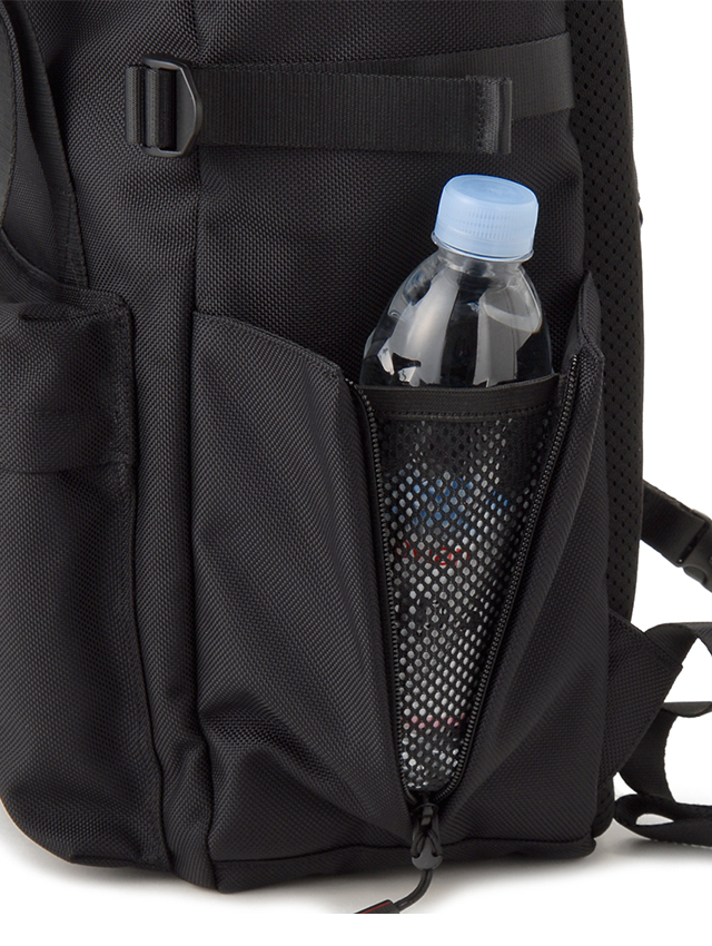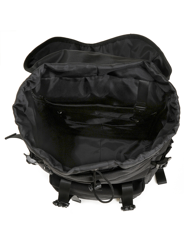 本格アウトドアスペックのトップローディングタイプ。ファッション性も兼ね備えた2本のストラップデザインがアーバンライクで印象的。上部からは雨蓋+雨などの侵入を防ぐ巾着開閉と、デイリーユースでストレスの無いよう背面サイドからファスナー開閉で直接メインコンパートメントにアクセス可能。外側は雨蓋下にファスナーポケットがあり大切な小物の収納に、下部にはマチ付きのファスナーポケットがあり使用頻度の高い小物類の収納に活躍します。メインコンパートメントはノートPCや雑誌、ポーチやタンブラーなどが余裕をもって整理し収納可。 不用意に下がり開きにくいファスナー調整機能の付いた両サイドポケットもペットボトル収納などスマートに活躍します。