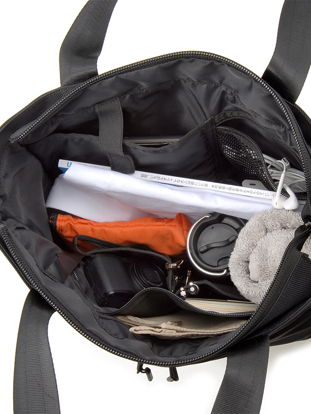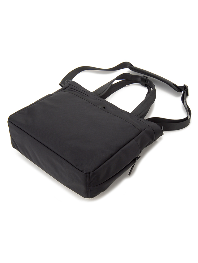 ブラックレーベルのデザインコンセプトを落とし込んだ正面・サイドのポケットデザインが機能的で秀逸。スポーツカジュアルで都会的なスタイルの2WAYトート。1~2泊くらいの出張や旅行をこなす絶妙なサイジングです。スーツやビジカジコーデにも相性が良く、ビジネスシーンのトータルコーディネートを引き締めます。ファスナー開閉付きのメイン室は書類・衣類・ポーチ、タンブラー等を余裕を持って収納でき、メッシュポケットなど多彩なポケットでガジェット類や小物、タブレット等が仕分けしやすく配したポケットが使い勝手抜群です。外側の正面左右のファスナーポケットには長財布やミニサイズのタブレット・ポーチ類の収納ができ、縦ファスナーポケットには直ぐに取り出したい小物が収納可。背面にはID・パスケースやスマートフォン(幅約7.3㎝までの機種に限る)が収納できるスマートポケットと、書類等の収納に便利な開口幅の広いポケットがあります。不用意に下がり開きにくいファスナー調整機能の付いた両サイドポケットもペットボトル収納などスマートに活躍します。