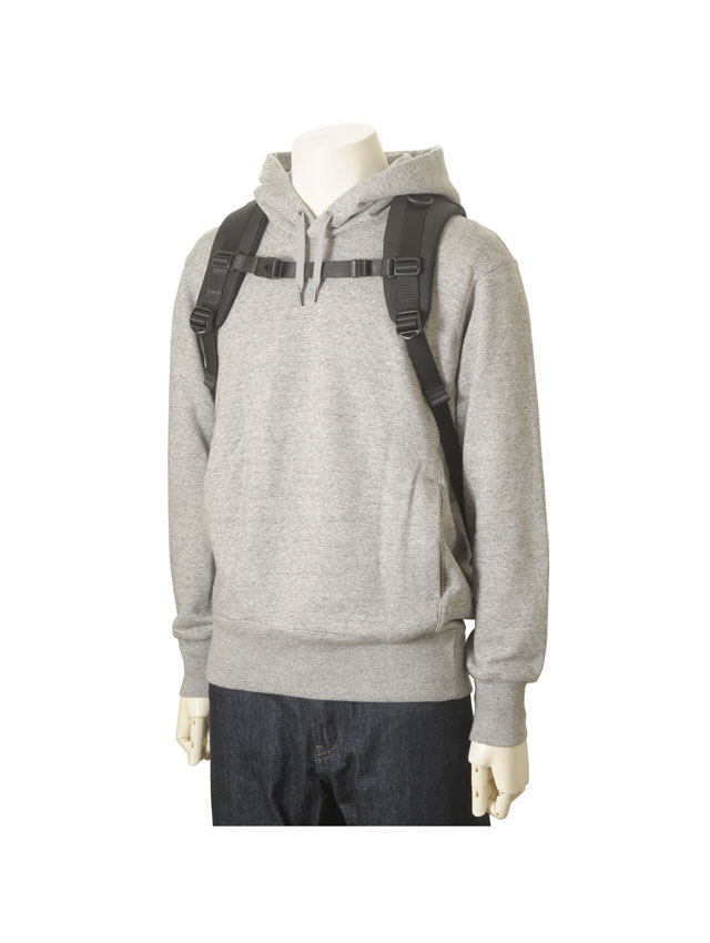 - ショルダーハーネスは表面にCORDURAR Ballistic、裏面にメッシュ素材を採用。極力肩の負担やズレ落ちが少なくなるよう機能美を追求した曲線デザインを採用。またアクティブシーンでは必需の左右留めのチェストストラップを装備。