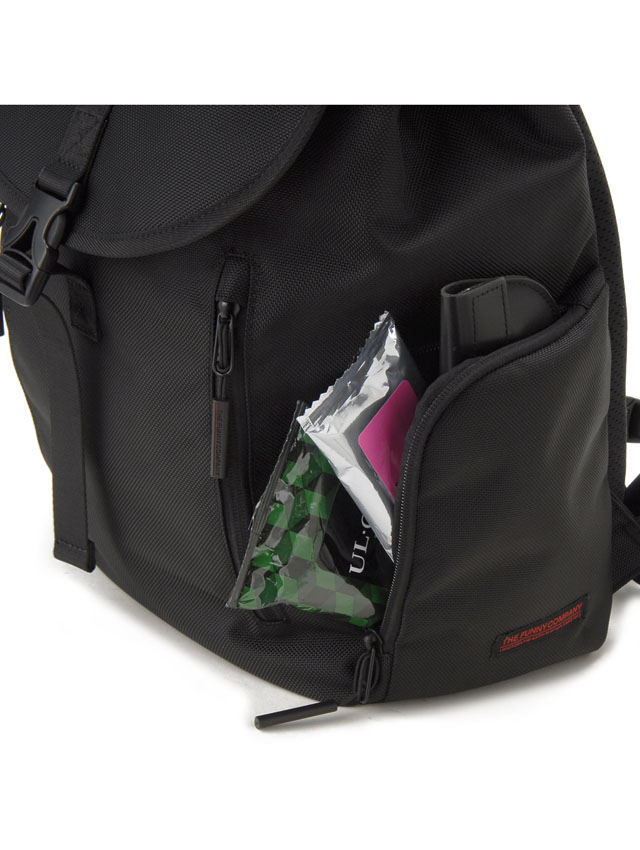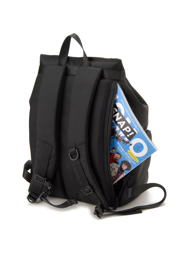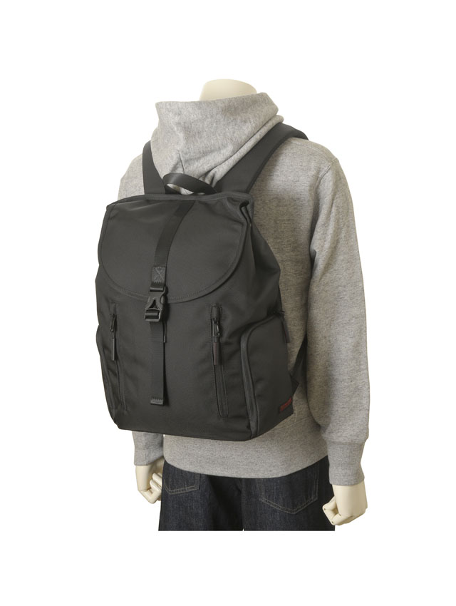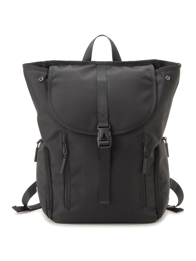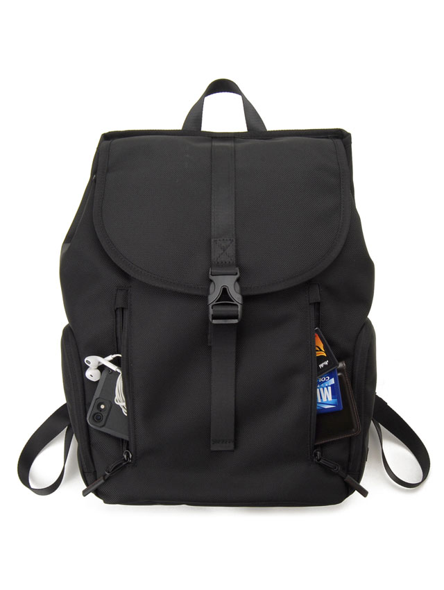 ミニマルデザインで大きすぎず小さすぎない通勤や通学等、デイリーに活躍のバックパックです。シンプルなフラップ+カプラー開閉で本体開閉口には荷物の容量に応じホック調整ができ、デイリーユースでストレスの無いよう背面サイドからファスナー開閉で直接メインコンパートメントにアクセス可能。外側には正面の2つの縦ファスナーポケットと両サイドのL字ファスナーポケットで使用頻度の高い小物の収納に活躍。メイン室内背面にはノートPC収納ポケットと取り外し可能なキーストラップが付きシンプルながらポイントを押さえた仕様です。スッキリとしたデザインなので幅広いコーディネートへの対応力も魅力です。