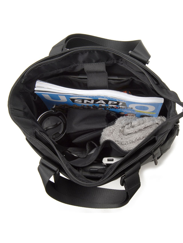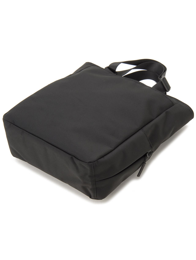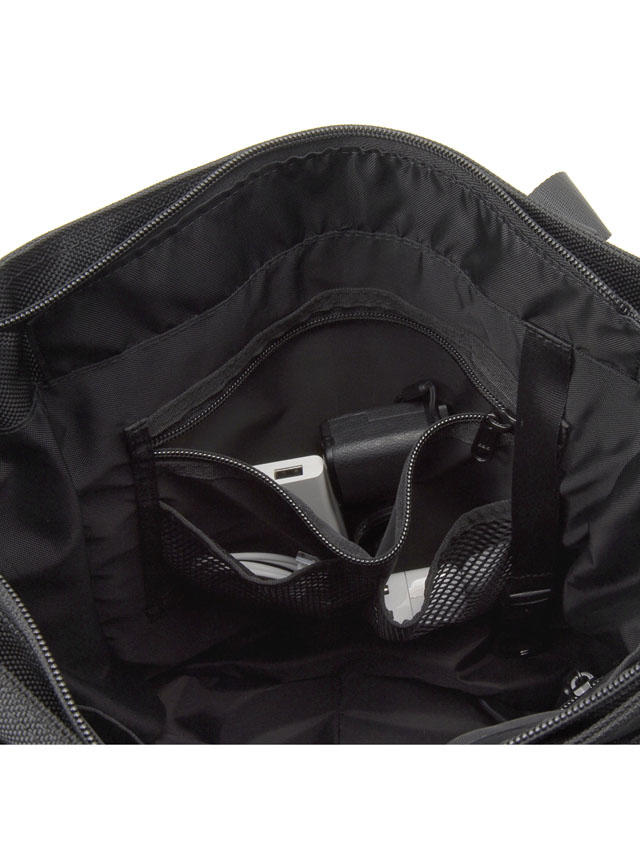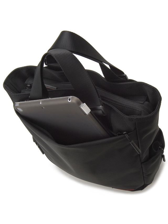 スマート&ミニマルデザインながら多彩な収納ポケットを配したトートバッグ。タブレットやノートPC類と書類や小物をスマートに持ち運べカジュアルからビジネスシーンにもオススメです。持ち手は必要に応じ長さ調整することで肩掛けが可能。外側には正面に小物の収納に便利な縦ファスナーポケットと上部にファスナーポケット、背面にホックポケット(中にスマートフォンなどの収納に使えるW8×H14×D3㎝サイズのオープンポケット付き)があり、それぞれタブレット等の薄マチの荷物の出し入れに便利。また、両サイドポケットはカードケースやスマートフォンを入れても取り出しやすい深さに設定。調整ファスナーを広げる事でペットボトル収納としても活躍します。内側はノートPC収納、ファスナーポケット(2)、オープンポケット(2)、メッシュポケット(2)と多種多様なポケットを備え大切な荷物+ガジェット類の仕分け収納が可能です。ビジネス使いの他、休日のお出掛けにも大き過ぎないサイズが家族のちょっとした荷物をまとめて持ち運べたり活躍しそうです。