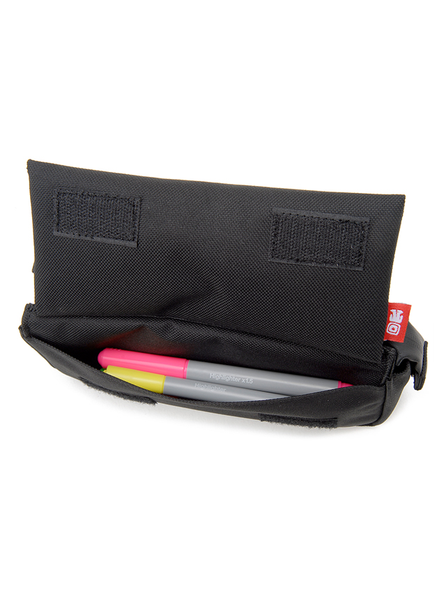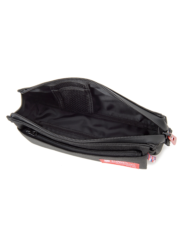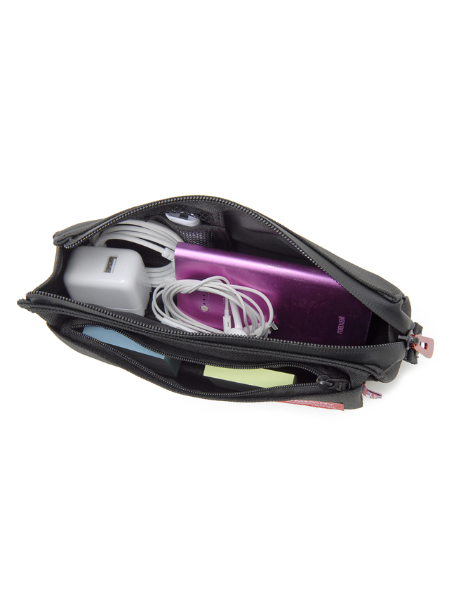 旅行にビジネスに多用途で使えるポーチです。細かなガジャット類や筆記用具などがポケットやメイン室で仕分け収納がしやすくなっております。特にフロントのファスナーポケットがフラップになっており上に上げると更にポケットがあるユニークな仕様になっております。女性であればコスメ類の仕分け携帯用ポーチ等にも活躍しそうなアイテムです。