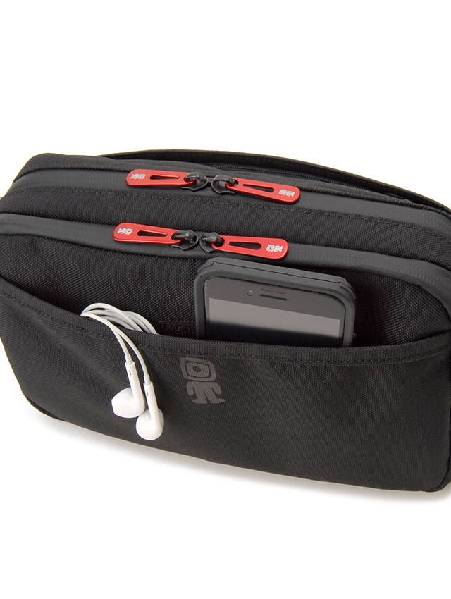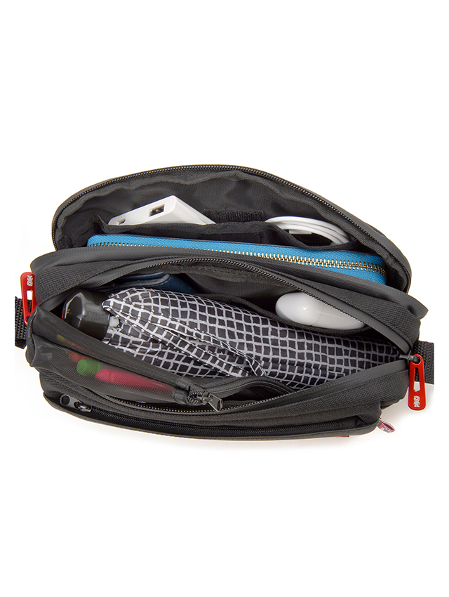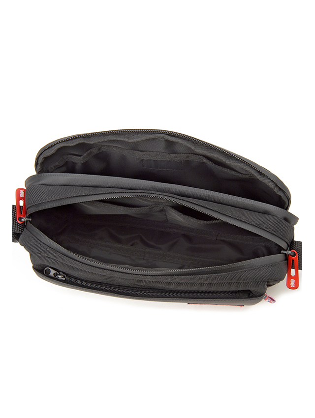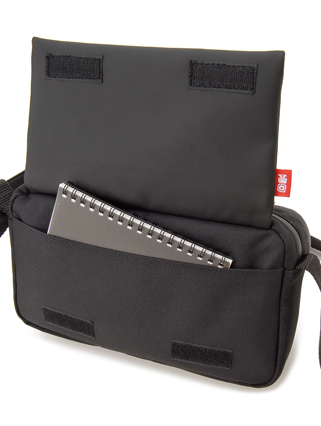 デイリーユースに活躍のコンパクトサイズながら多彩なポケットを備えたの横長ショルダー。メインは2層となり、フロント側はマチ幅があり折り畳み傘や小物を、背面側は薄マチですが長財布や細かなモバイル関連の小物が収納可。また正面には使用頻度の高い小物の収納に活躍のフラップデザインのポケットや、そのフラップポケットが蓋になるよう本体前面にポケットを配しております。本体背面のスリットポケットにはスマートフォンやイヤフォンを簡易的に差し込んでおくのに便利です。