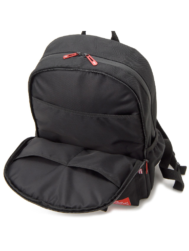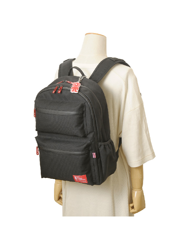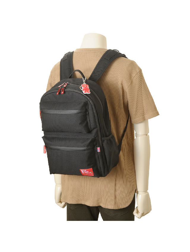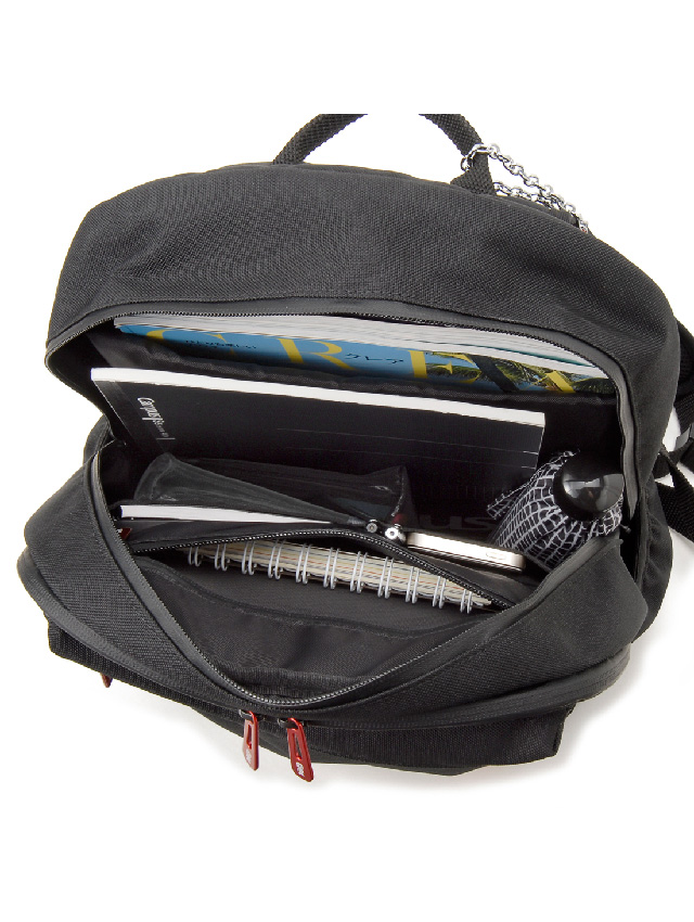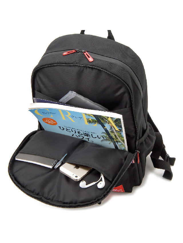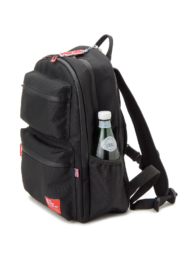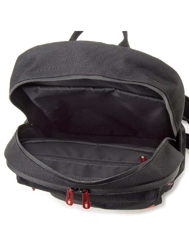 正面上下に配されたファスナーポケットがアイキャッチでもあり機能的。上段には必要な際にさっと取り出したい小物を、下段には長財布がすっぽり入るくらいの容量があります。本体前面にはファスナーで大きく開くパネルポケットがあり中にはオープンポケット(3)を備え薄マチの荷物や小物のスマートな収納に対応。両サイドにはオープンポケットを配し、ペットボトルを差し込んだり深すぎないのでICカードケースを入れたりと片方の肩を外して取り出せる基本仕様ながらあると便利です。メイン室も中が見やすいよう大きく開くファスナー開閉で、中にはノートPC収納やファスナーポケット、オープンポケット(2)を備え、使いたい荷物の探しやすさに配慮した仕様です。